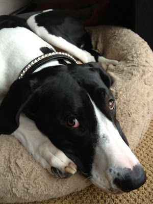 Snug as a bug in a rug. Pacer in his new home and his new comfy bed.